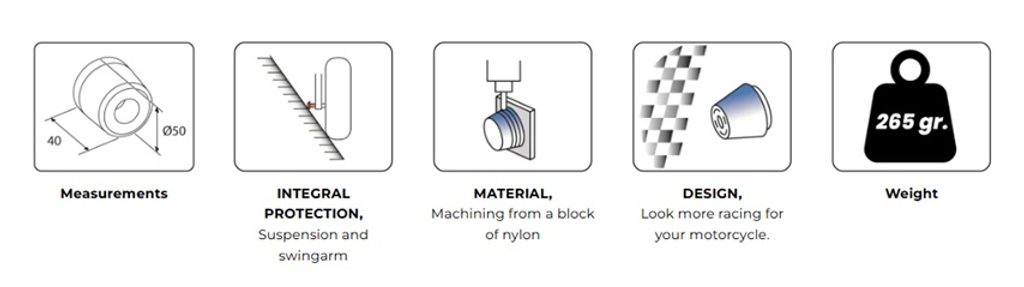 Machined from a nylon block, with a reduced weight of 265 gr and 40 mm long x 50 mm in diameter, it will be the perfect and integral protection for both the fork and the suspension.