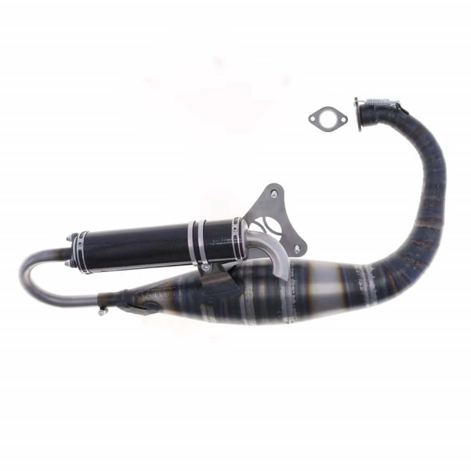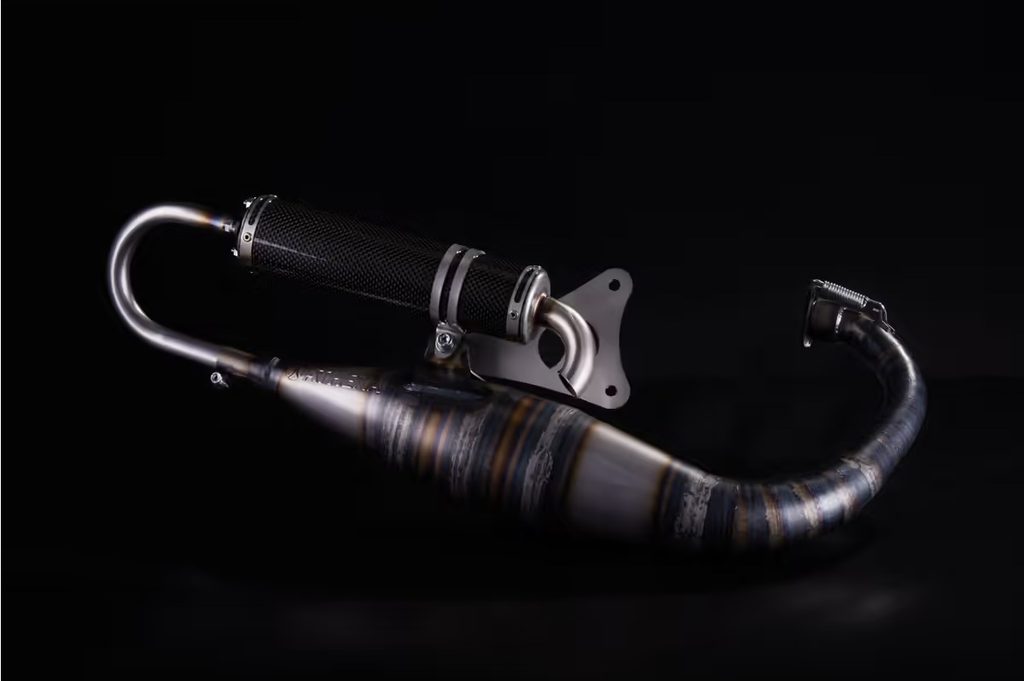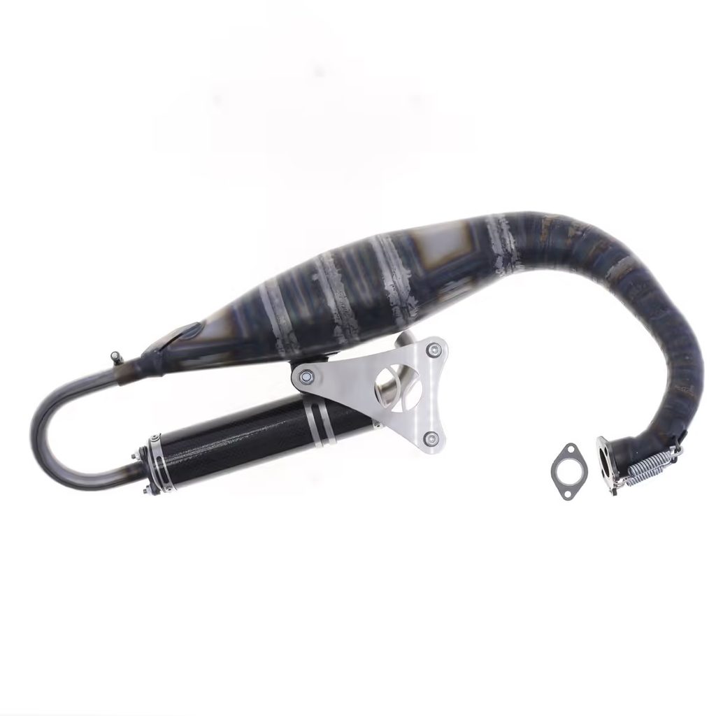 The design is unique, as this Booster racing muffler is produced in high-quality 0.8 mm steel to ensure ultimate performance on any model of scooter. To respect the geometry, the muffler is made up of more than 18 sections that are hand-welded to each other, and includes a carbon silencer to ensure lightness as well as maximum resistance.