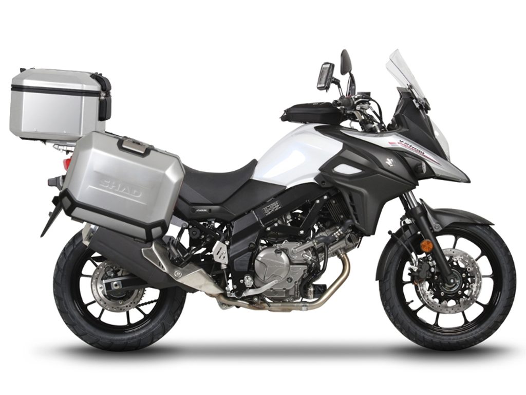 The complete set of cases SHAD TERRA includes aluminum top case TR48 with a capacity of 48L and aluminium left and right case TR36 with a capacity of 36L . The set contains everything you need to mount both suitcases to the motorcycle.