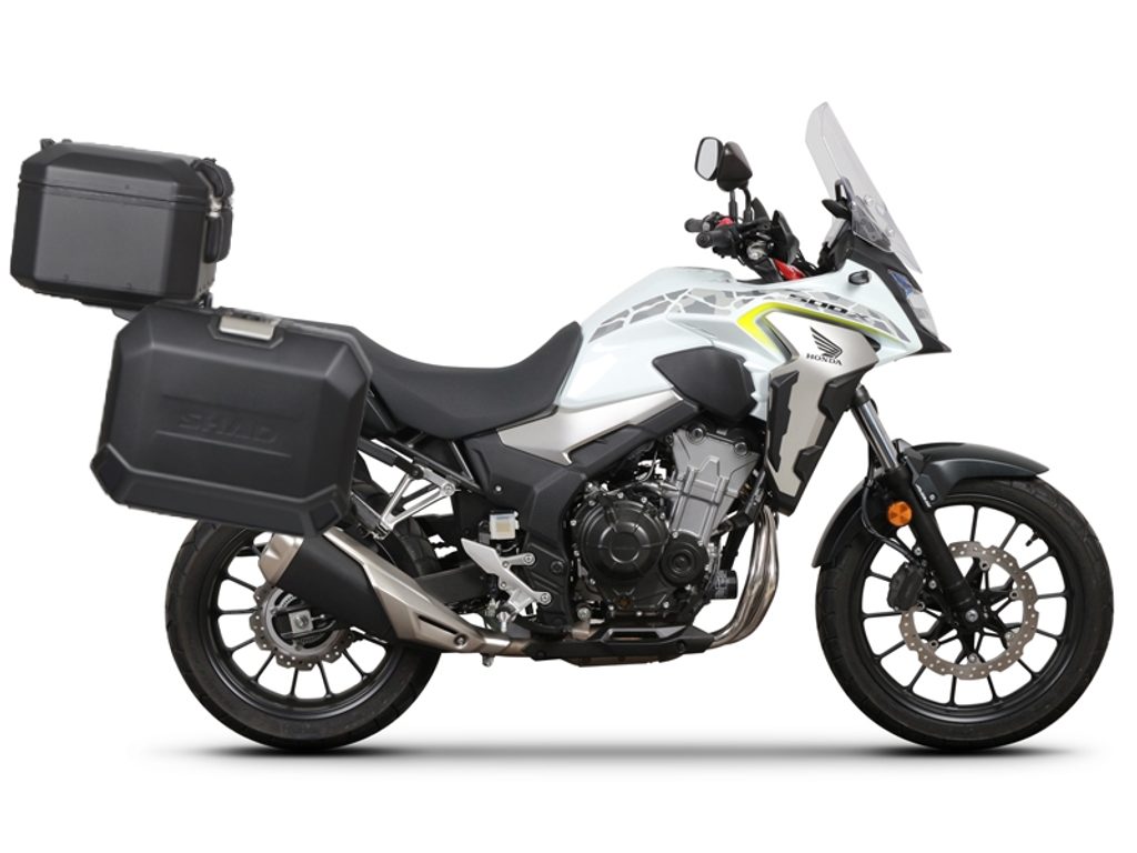 The complete set of cases SHAD TERRA BLACK includes black aluminum top case TR37 with a capacity of 37L, black aluminium left and right case TR47 with a capacity of 47L. The set contains everything you need to mount both suitcases to the motorcycle.
