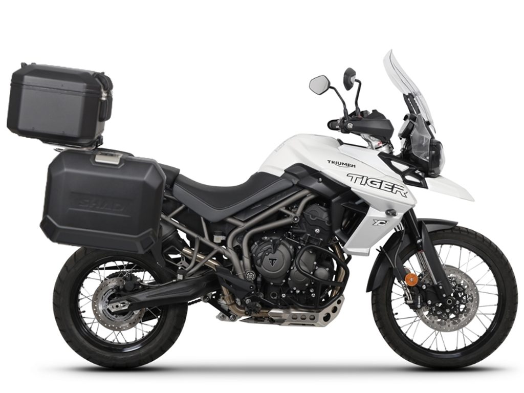 The complete set of cases SHAD TERRA BLACK includes black aluminum top case TR37 with a capacity of 37L, black aluminium left case TR47 with a capacity of 47L and a smaller black right case TR36 with a capacity of 36L due to the location of the exhaust. The right suitcase will not protrude. The set contains everything you need to mount both suitcases to the motorcycle.