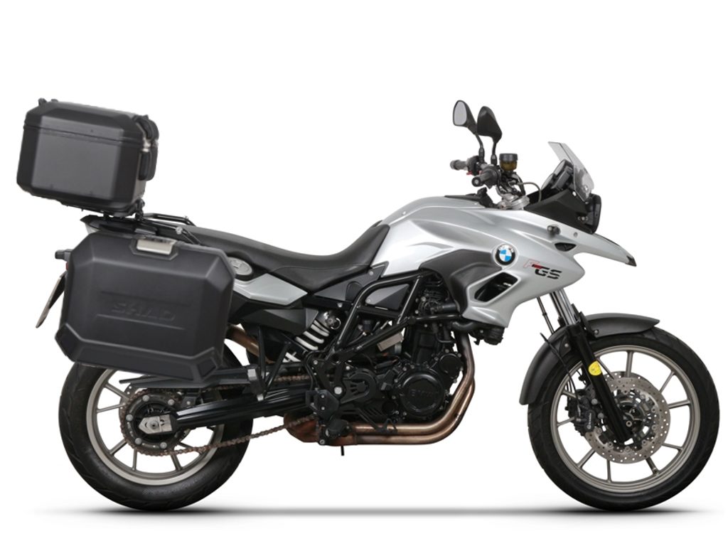 The complete set of cases SHAD TERRA BLACK includes black aluminum top case TR48 with a capacity of 48L, black aluminium right case TR47 with a capacity of 47L and a smaller black left case TR36 with a capacity of 36L due to the location of the exhaust. The left suitcase will not protrude. The set contains everything you need to mount both suitcases to the motorcycle.