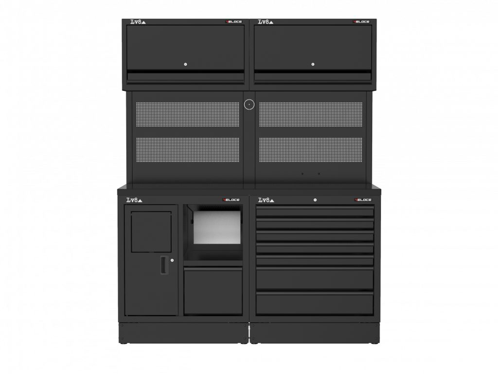 Workbench L. 1600 mm configured with service cabinet with waste bin, paper compartment and storage drawer, 7-drawer cabinet with key lock. Wooden top with double perforated tool holder panel, 2 wall storage cabinets and provision for an electric socket. Also available in stainless steel or melamine top versions.