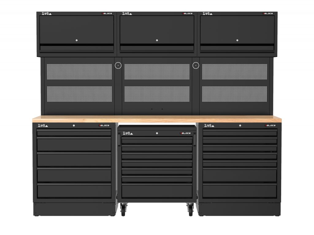 Workbench L.2400 mm configured with 5-drawer cabinet, 7-drawer tool storage trolley and 7-drawer cabinet. Wooden top, 3 perforated tool holder panels with wall storage cabinets and provision for an electric socket. Also available in stainless steel or melamine top versions.